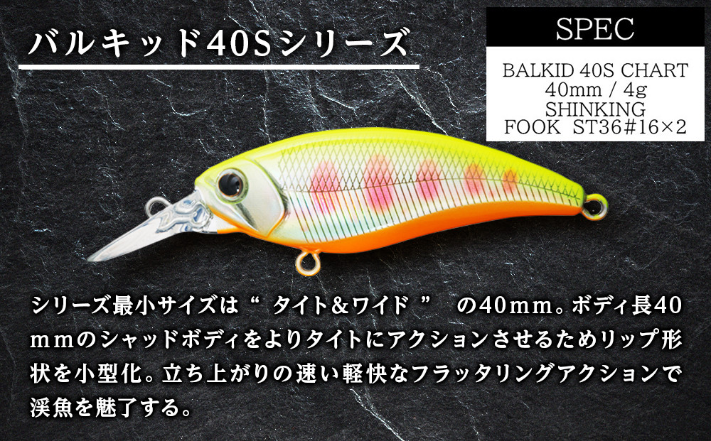 シリーズ最小サイズは “ タイト&ワイド ” の40mm。ボディ長40mmのシャッドボディをよりタイトにアクションさせるためリップ形状を小型化。急流の中でよりいっそう発揮される抜群の安定感はダウンストリームでは軽やかな引き心地とともにハイピッチの振動を伝えロッドアクションを加えるとシャッドらしいワイドなフラッシングでハイアピールし、アップストリームにおけるロッドワークには素早く反応し立ち上がりの速い軽快なフラッタリングアクションで渓魚を魅了する。