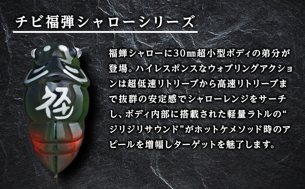 福蝉シャローに30㎜超小型ボディの弟分が登場。ハイレスポンスなウォブリングアクションは超低速リトリーブから高速リトリーブまで抜群の安定感でシャローレンジをサーチし、ボディ内部に搭載された軽量ラトルの“ジリジリサウンド”がホットケメソッド時のアピールを増幅しターゲットを魅了します。