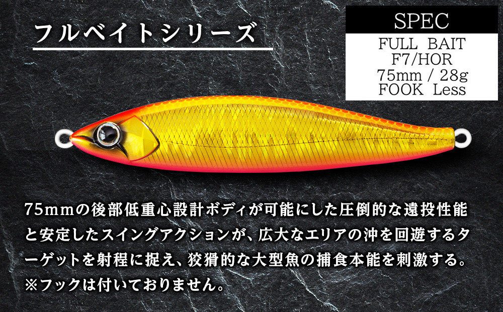 海・湖・河川、フィールドを問わず数々の大物をしとめてきた万能ジグミノー【フルベイト】75mmの後部低重心設計ボディが可能にした圧倒的な遠投性能と安定したスイングアクションが、広大なエリアの沖を回遊するターゲットを射程に捉え、狡猾的な大型魚の捕食本能を刺激する。
