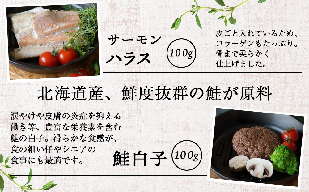 | 容量 | エゾ鹿ステーキ 100g エゾ鹿バーグ 100g サーモンハラス 100g 鮭白子 100g |
