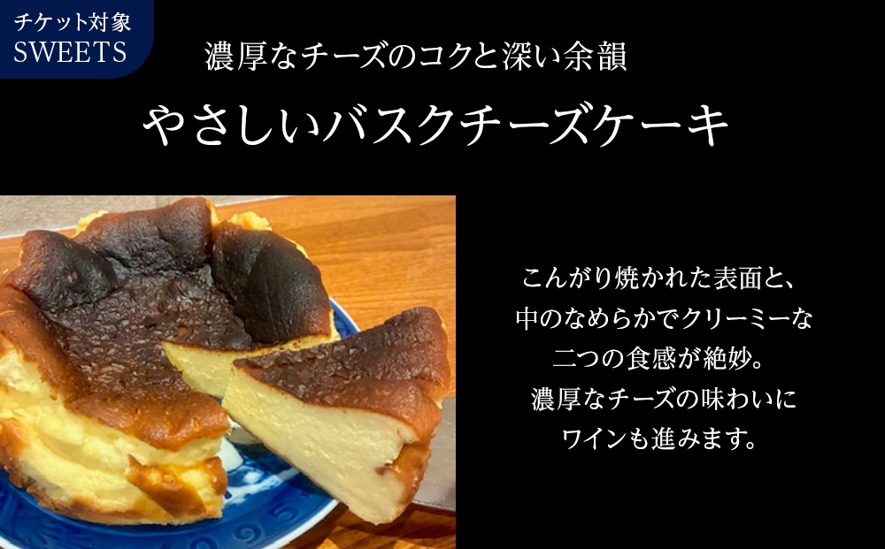 北海道産素材をふんだんに使ったバスクチーズケーキを、店舗で贅沢に味わえる限定チケットです。表面は香ばしく焼き上げられ、中はなめらかでとろけるような食感。濃厚なチーズのコクと深い余韻が口いっぱいに広がり、贅沢で大人な味わいを堪能できます。芳醇な風味はコーヒーやワインとも相性抜群で、食後のデザートや特別なひとときにぴったり。家族や友人と分け合えば食卓を華やかに彩り、大切な時間をさらに特別に演出する大人のスイーツです。