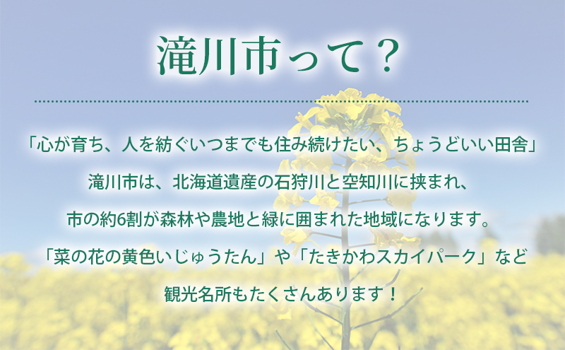 基幹産業は、農業で、水稲、小麦、たまねぎが主要作物ですが、搾油用に栽培している「菜の花」は、その景観の素晴らしさから、多くの観光客が訪れるようになり、開花時期に合わせて「たきかわ菜の花まつり」を開催しております。