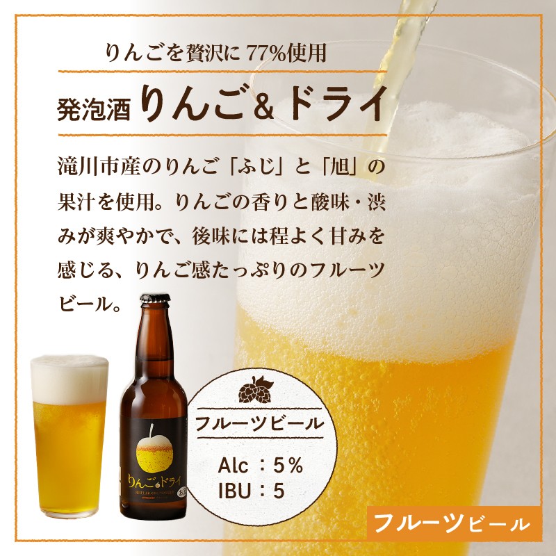 発泡酒の『りんご&ドライ』は、原料の77%を滝川市産のリンゴを使用し、フルーティーな香りとシャンパンの様な風味でリンゴ感たっぷり。