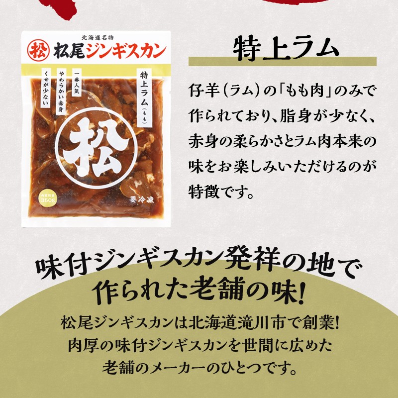 仔羊(ラム)の「もも肉」のみで作られた特上ラム!2パックセット!!松尾ジンギスカンは1956年、北海道滝川市で創業。 味付ジンギスカンを世間に広めた老舗のジンギスカンメーカーです。