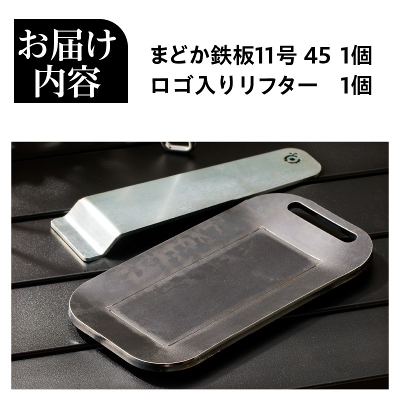 | 容量 | 【お礼品の内容】 ・まどか鉄板11号 45[1個] ・ロゴ入りリフター [1個] ・サイズ:155mm×83mm ・厚さ:4.5mm ・重量:0.42kg |