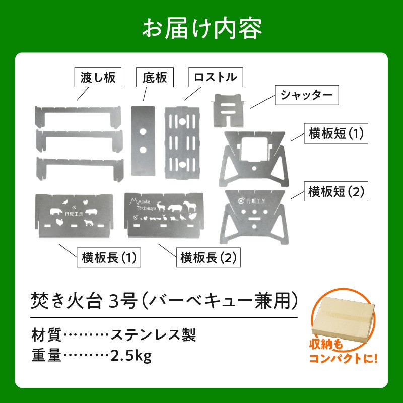 | 容量 | ステンレス製 焚き火台3号 最大寸法 :幅260mm x 奥行240mm x 高さ250mm(約) 本体重量:2.5kg 詳しくは画像をご覧ください。 梱包サイズ:311mm×228mm×24mm(約) 重量:約3kg |