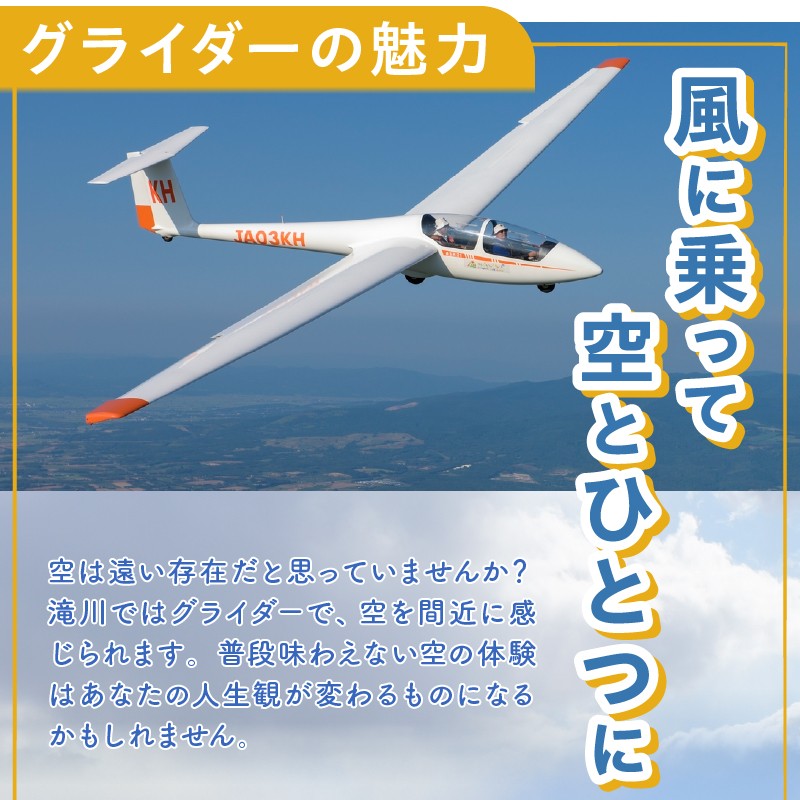 たきかわスカイパークでのグライダー体験飛行や、飛行トレーニング、施設利用料(滝川市航空動態博物館入館料、等)などに使用できる、滝川スカイパーク利用券をお届けいたします。