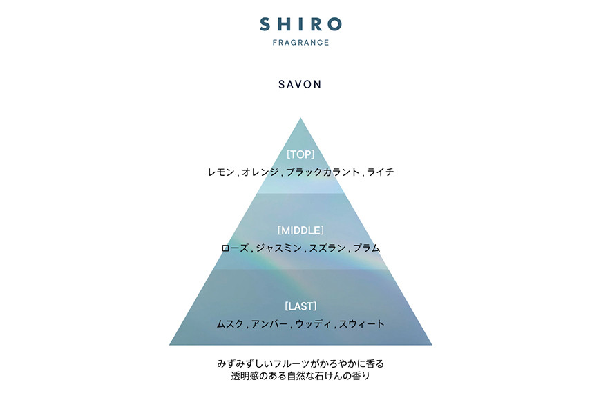 爽やかなフルーツが香る、清潔感漂う石けんをイメージした「サボン」の香り。