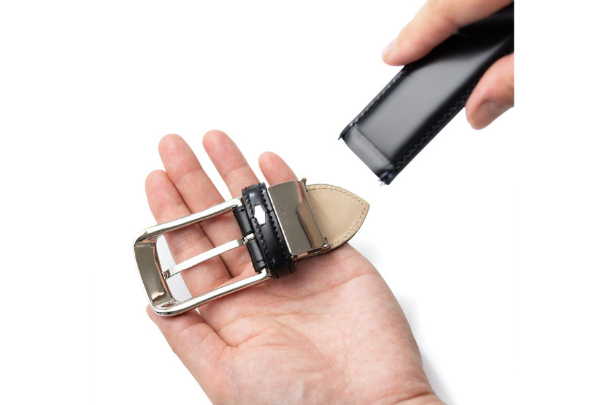 バックル・ベルト表面に高級感があり、皮もしっかりしているが、なによりもベルト裏側は染色されていない手触りも良い自然色の皮が良かった。