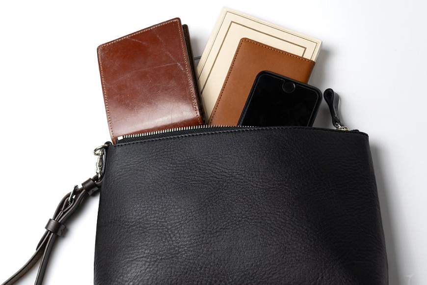 クラッチバッグは長財布やスマホなど、貴重品をコンパクトにまとめられる程よいサイズ感。