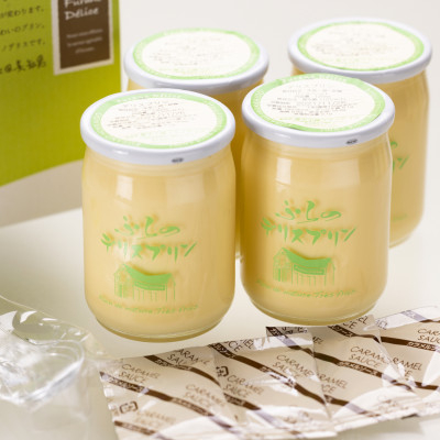 レシピはふらの牛乳プリンと同じですが、キャップが特殊で冷蔵保存で約2週間の日持ち。いちばん基本のプレーン4本詰です。
