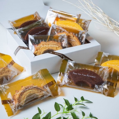 クリスピーバウムの個包装6個とソフトバウムクーヘンの個包装2個とソフトバウムに合う厳選したカカオパウダーを使用した、濃厚なふらの牛乳とカカオが香るショコラバウムの個包装2個がセットになったギフトセットです。