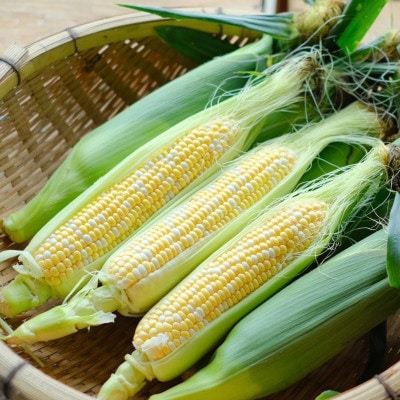 「バイカラーコーン」(バイカラー種)は、黄色粒種と白粒種を掛け合わせて作られたスイートコーンで、口に残らないほどの種皮のやわらかさと、甘みが強い品種です。