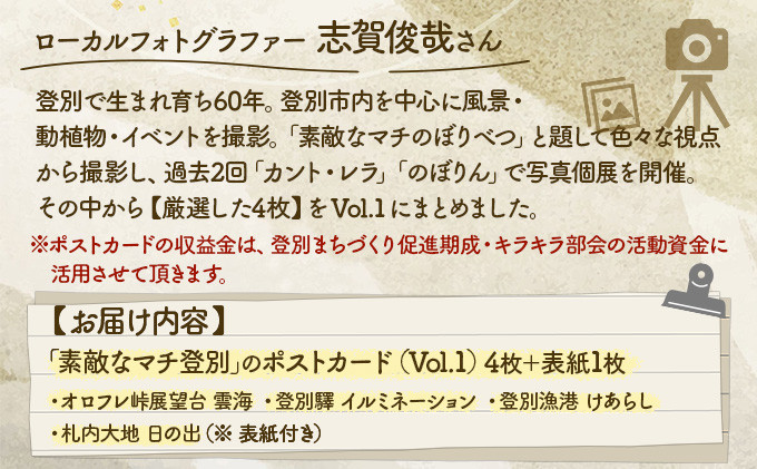 登別で生まれ育ち60年。写真家 志賀俊哉は素敵なマチのぼりべつをいろいろな視点から撮影しています。過去2回「カント・レラ」「のぼりん」で写真個展を開催し、多くの方に喜んでいただきました。その中から、厳選した4枚を、Vol.1にまとめました。