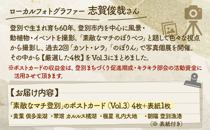 登別で生まれ育ち60年。写真家 志賀俊哉は素敵なマチのぼりべつをいろいろな視点から撮影しています。過去2回「カント・レラ」「のぼりん」で写真個展を開催し、多くの方に喜んでいただきました。その中から、厳選した4枚を、Vol.3にまとめました。