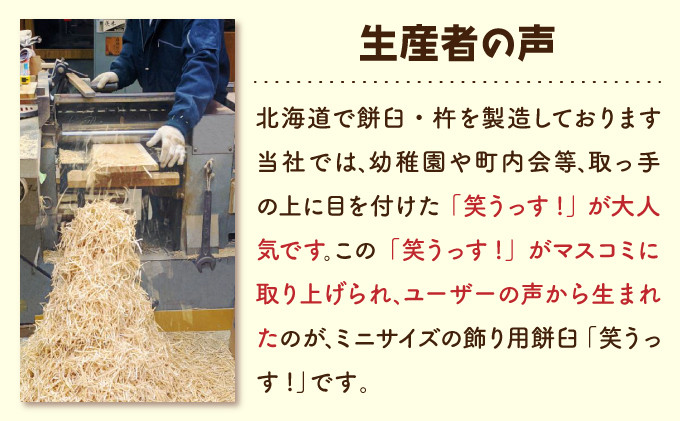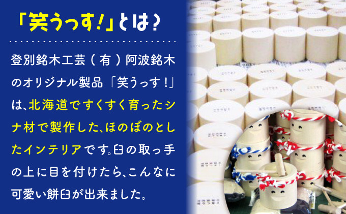 登別銘木工芸(有)阿波銘木のオリジナル商品「笑うっす!」は、北海道産材シナ材使用。臼を女性、杵を男性に見立て、餅を搗く(突く)ことで”子孫繁栄”。杵を振り下ろし、邪気を振り払う”厄払い”。取っ手を口に見立てた可愛らしい臼を飾って縁起を担いでくださいね!