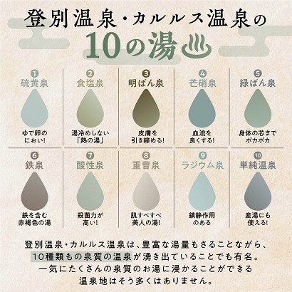 その豊富な湯量もさることながら、実は10種類もの泉質の温泉が湧き出ていることでも有名。