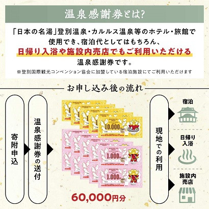 チョイスPayポイントと交換できる品 登別温泉で、贅沢なひとときを。感謝券で、名湯と美食を満喫する旅へ。 のぼりべつ温泉感謝券60,000円分 日本の名湯 登別温泉 カルルス温泉 ホテル登別国際観光 コンベンション協会 温泉旅館 温泉宿 温泉旅館 ホテル 温泉ホテル ふるさと納税 北海道 登別市