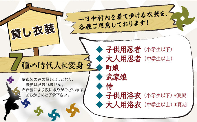 登別伊達時代村 貸し衣装 大人用忍者(中学生以上)13,000 円 一歩踏み込めば、そこは時空を超えた江戸時代。 街道に軒を連ねる商家に勇壮な武家屋敷、あっと驚くカラクリ満載の忍者屋敷…… 北海道の大自然に溶け込んだ情緒あふれる街並みに、武士が、忍者が、花魁が、町人たちが息づき、迫力のアクションや華麗なパフォーマンスに彩られた一大エンターテイメント空間が広がっています。 日常をしばし離れて、ひとときの時間旅行を心ゆくまでお楽しみくださいませ。 お殿様やお姫様に変身して記念撮影! 写真はその場ですぐお渡しします。 一日中村内を着て歩ける貸衣装も各種ご用意! ※画像はイメージです。 ※有効期限:発行から1年 ※返金、換金等はいたしかねますのでご了承ください。 ※利用可能な営業時間、営業日程についてはホームページを確認ください。 ※こちらの返礼品は着付け+写真撮影のみとなり【入村チケット】【着付け+写真撮影】のチケットは含まれておりません。 各返礼品ページにて受け付けておりますので、ページ内のリンクより返礼品ページへお進みください。 株式会社 登別伊達時代村 - 常温便