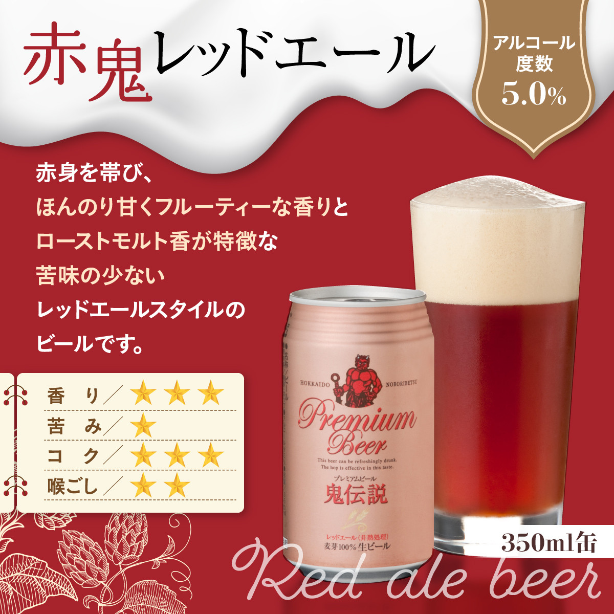 国内外のビールコンペで受賞歴のある自慢の地ビール詰合せです。【青鬼ピルスナー】登別の美味しい水と麦芽100%を使用。すっきり爽やかで苦みがほど良く、くせの少ない生ビール。【赤鬼レッドエール】登別の美味しい水と麦芽100%を使用。炒った麦芽を使ったことで赤みを帯びて、香ばしさが増した苦みが少ない飲みやすい生ビールです。