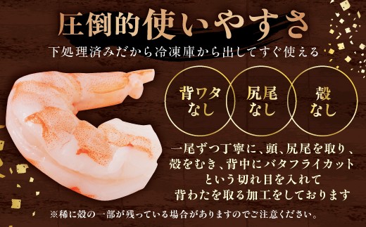 身質がしっかりとして、歯ごたえがよく、プリっと食感が特徴のブラックタイガーを、下処理なしですぐに調理できるように加工しました。