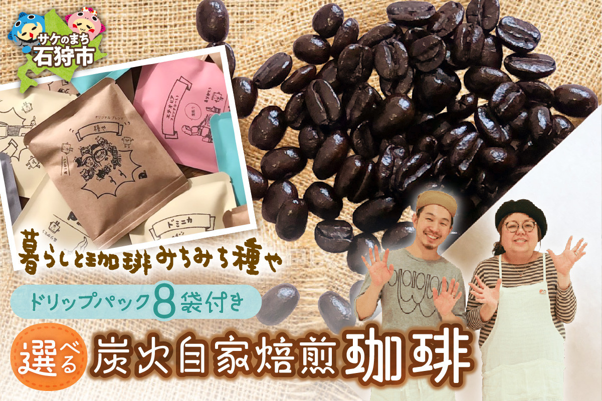 みちみち種や焙煎所からできたての珈琲が、おいしい時間となりますように。 炭火自家焙煎珈琲(豆or粉)+ドリップパック(12g×8種類)|ふるさと納税 北海道 石狩市 コーヒー 豆 粉 挽き立て ドリップコーヒー ブラックコーヒー
