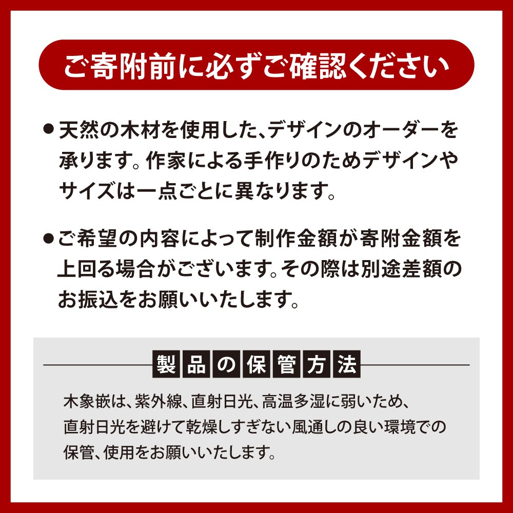 | 容量 | 設定金額の範囲で、サイズ、デザインをフルオーダーで承ります。 写真は一例です。すべてご相談を受けて制作致します。 返礼品情報:木工美術品 木象嵌(もくぞうがん) 名称:木象嵌 内容量:1個 備考:設定金額の範囲内で、サイズ、樹種、デザインのオーダーが可能です。 ■ご寄附前の流れ ご寄附前に必ず絵柄、ご要望などを事業者の下記連絡先までご連絡ください。 TEL:090-7642-6822 Mail:vicklebykyrka.1029@gmail.com |