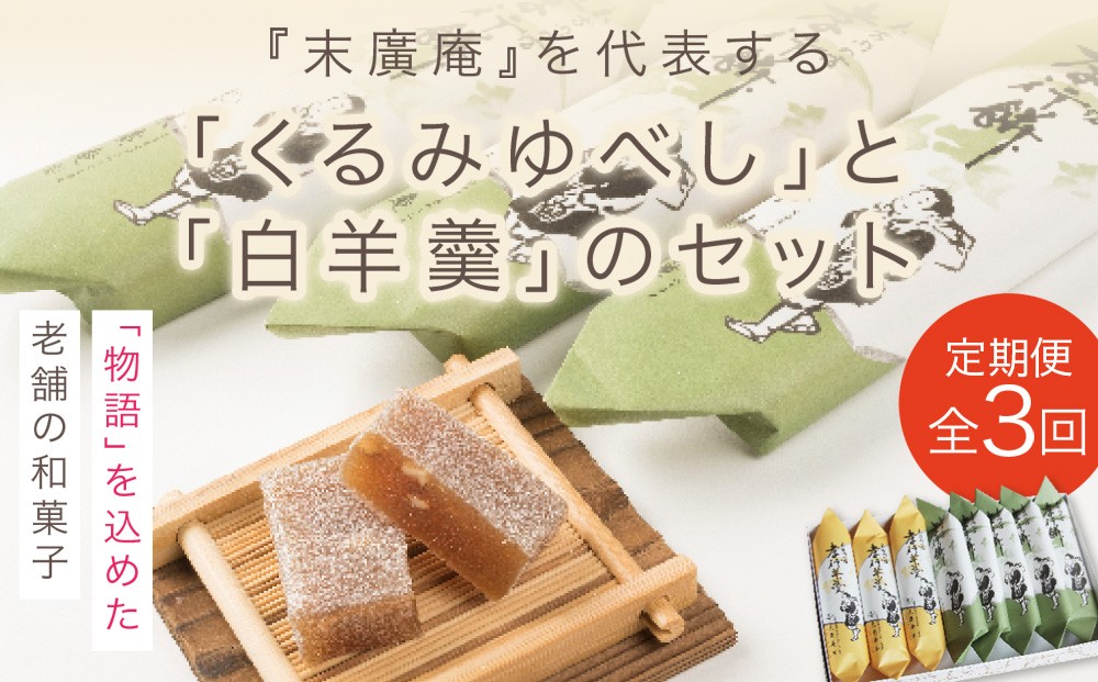 ◆〈「物語」を込めた老舗の和菓子*定期便全3回〉『末廣庵』を代表する「くるみゆべし」と「白羊羹」のセット。