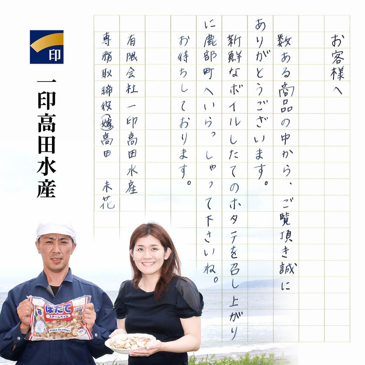 お礼品生産者、一印高田水産の高田未花です。
