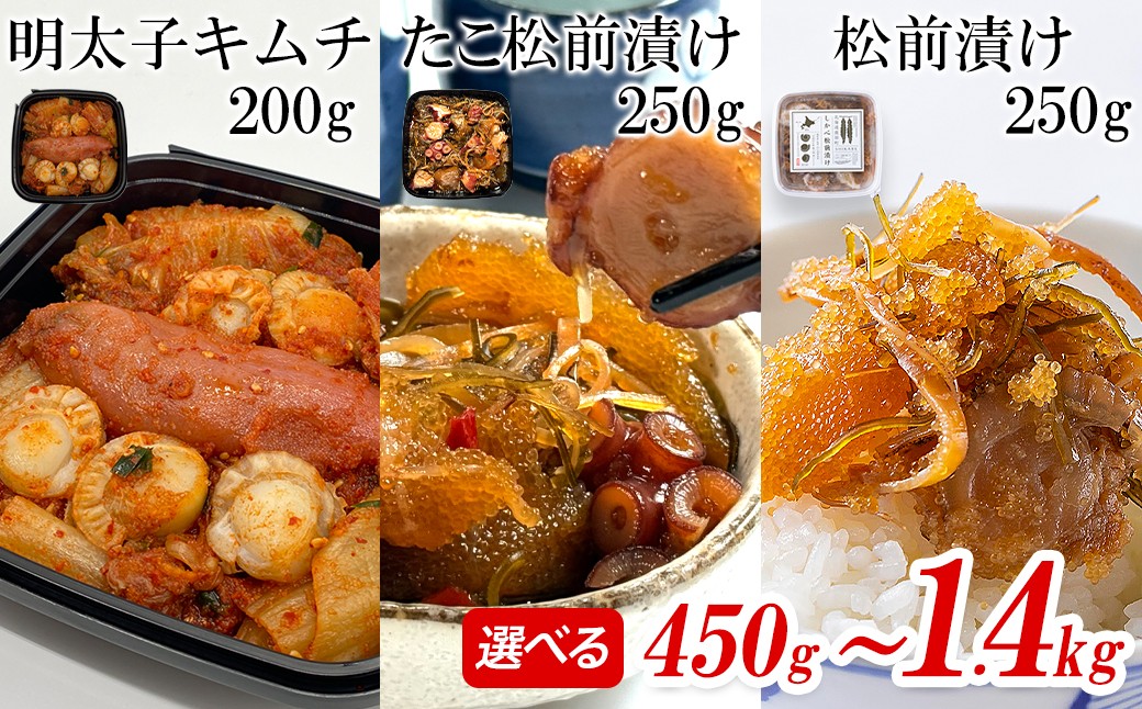| 容量 | 【選べる内容量】450g~1.4kg しかべ松前漬け1パック(250g) しかべたこ松前漬け1パック(250g) しかべ旨辛ほたて明太子キムチ1パック(200g) |