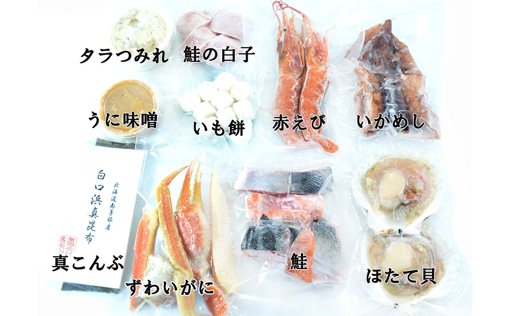 作り方も丁寧に説明が有り、個人的には子持ちのエビが大ヒット。つみれもフワフワ、イカ飯、初めて食べる芋餅もモチトロで期待以上。シャケやカニ、ホタテはまあまあでしたが自宅で石狩鍋がこんなにたくさんの海鮮で楽しめて、野菜やラーメンを足して大満足しました。