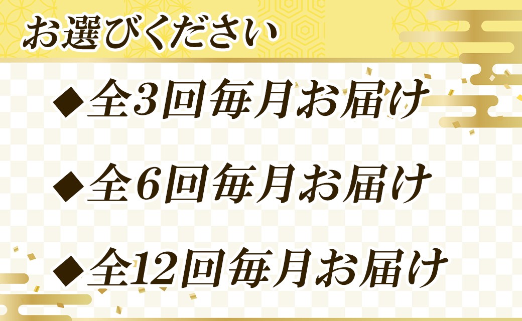 入金確認後、毎月上旬に発送(お申込みのタイミングによっては翌々月からの発送開始となりますのでご了承ください) 【配送について】 ◎お届け日のご指定は承っておりません。ご不在等でお受け取りいただけない期間がある場合は、お申込み時に備考欄にご記載くださいませ。お届け時間帯はご指定いただけます。 ◎発送時にお知らせメールをお送りしております。お電話等でのご案内は承っておりませんのでご了承くださいませ。 ◎ご不在等が続きお受け取りいただけなかった場合、お礼品は返送されます。その場合、再発送は承っておりませんのでご承くださいませ。 ◎宅配ボックスへの配達をご希望の場合は、備考欄にご記入くださいませ。 |