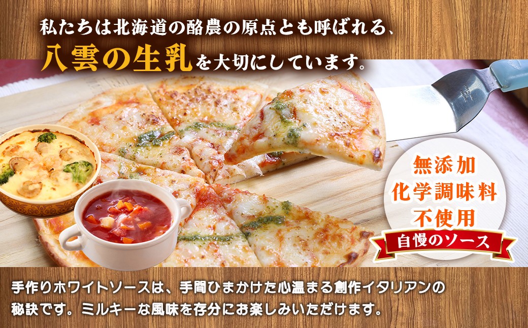 八雲町の生乳を使用したお家でお手軽イタリアン!添加物・化学調味料不使用で安心! ピアット自家製お手軽イタリアンセット[八雲育ちの気まぐれドリア2個、八雲育ちの気まぐれグラタン2個、ピッツァ2種(八雲こだわり牛乳生地のマルゲリータ、八雲こだわり牛乳生地の4種のチーズピッツァ)、スープ2種(八雲育ちのクラムチャウダースープ、八雲育ちのミネストローネスープ)]【 イタリアン セット ドリア グラタン ピッツァ 洋食 イタリアン料理 八雲町 北海道 】