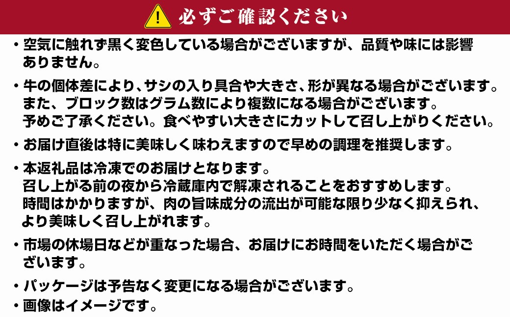 ※牛の個体差によりサシの入り具合や、大きさや形が異なる場合がございます。またブロック数はグラム数により、複数になる場合・小さなお肉が含まれる場合がございます。予めご了承ください。