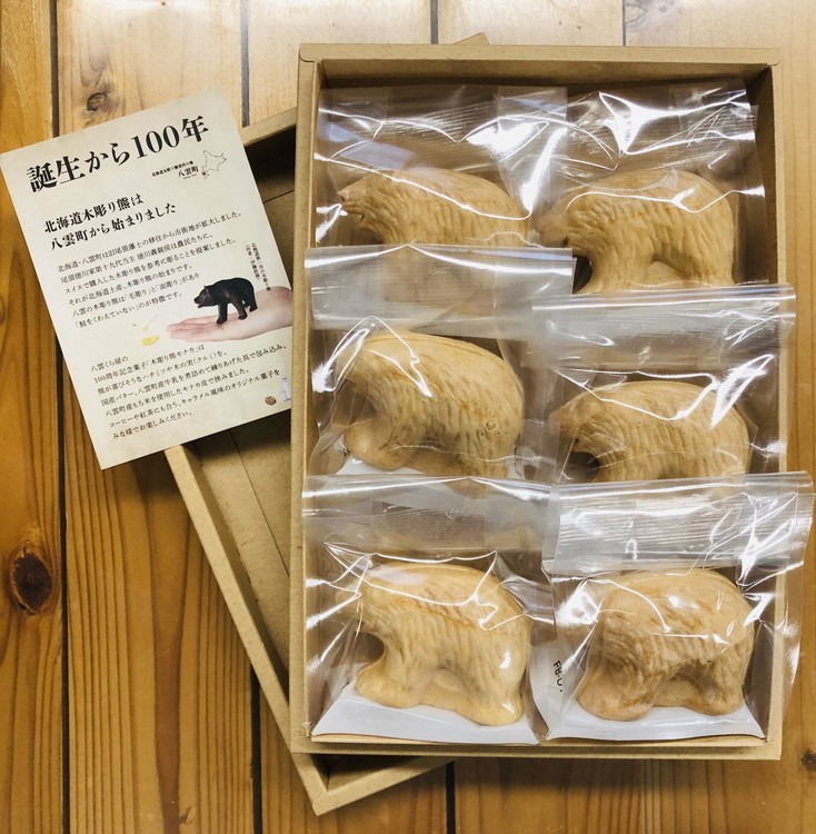 八雲町木彫り熊発祥100周年を記念して作成した木彫り熊モナカは、木の実を食べる熊から着想を得て、クルミと某熊のキャラクターの好物ハチミツを使用。