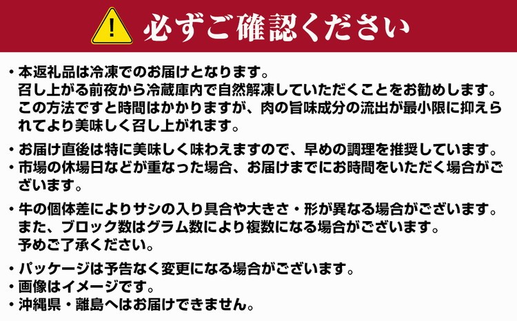 ※牛の個体差により、サシの入り具合や、大きさや形が異なる場合がございます。またブロック数はグラム数により、複数になる場合・小さなお肉が含まれる場合がございます。予めご了承ください。