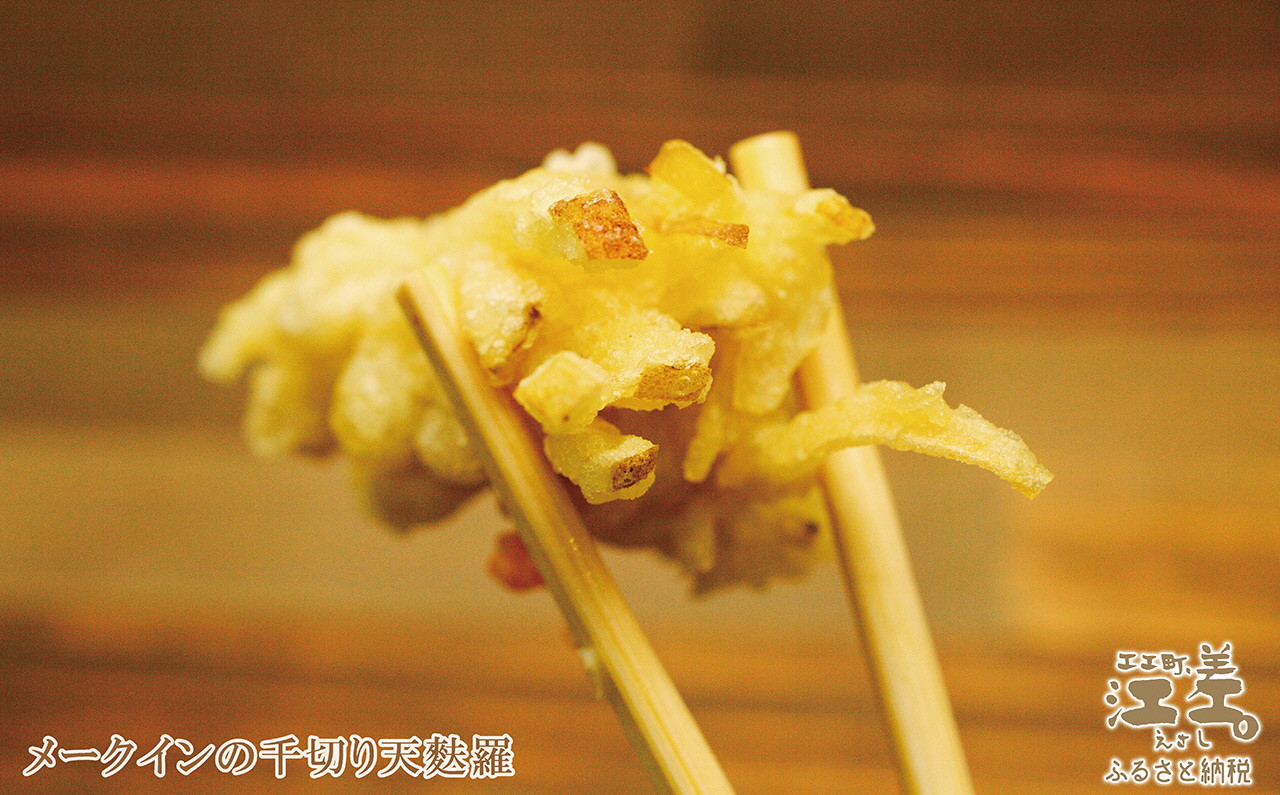 ねっとりなめらかな質感でほのかな甘みが特徴のメークイン。とくに大事に年を越させた江差の「越冬メークイン」は、甘みが強く、自信を持っておすすめできる味です。おすすめの食べ方は「いもの塩煮」。シンプルに水と塩で煮たメークインは、いもの甘みがダイレクトに味わえます。「イカの塩辛」をのっけて食べるのが昔ながらの江差流。