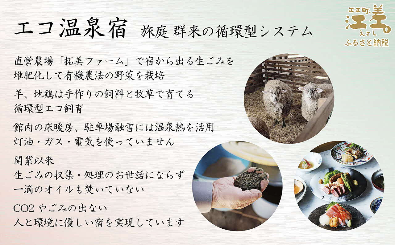 施設から出る生ごみは全て直営農場「拓美ファーム」で堆肥化して有機農法の土づくりに活かし、また、熱交換設備によって給油・暖房に温泉熱源を有効活用して館内を温めております。開業以来一滴のオイルも焚いていませんし、生ごみの収集処理のお世話になったこともありません。地球への愛と資源循環の思想を貫く「究極のエコ温泉宿」です。