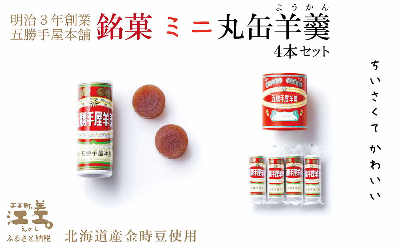 この自治体のポイントについてチョイス公式ポイント交換対象 江差名物 糸で切るようかん 北海道産金時豆使用 五勝手屋本舗『ミニ丸缶羊羹(ようかん)』4本セット 金時豆のようかん 保存料不使用 五勝手屋羊羹の老舗 和菓子 銘菓 名物 贈答用 ギフト