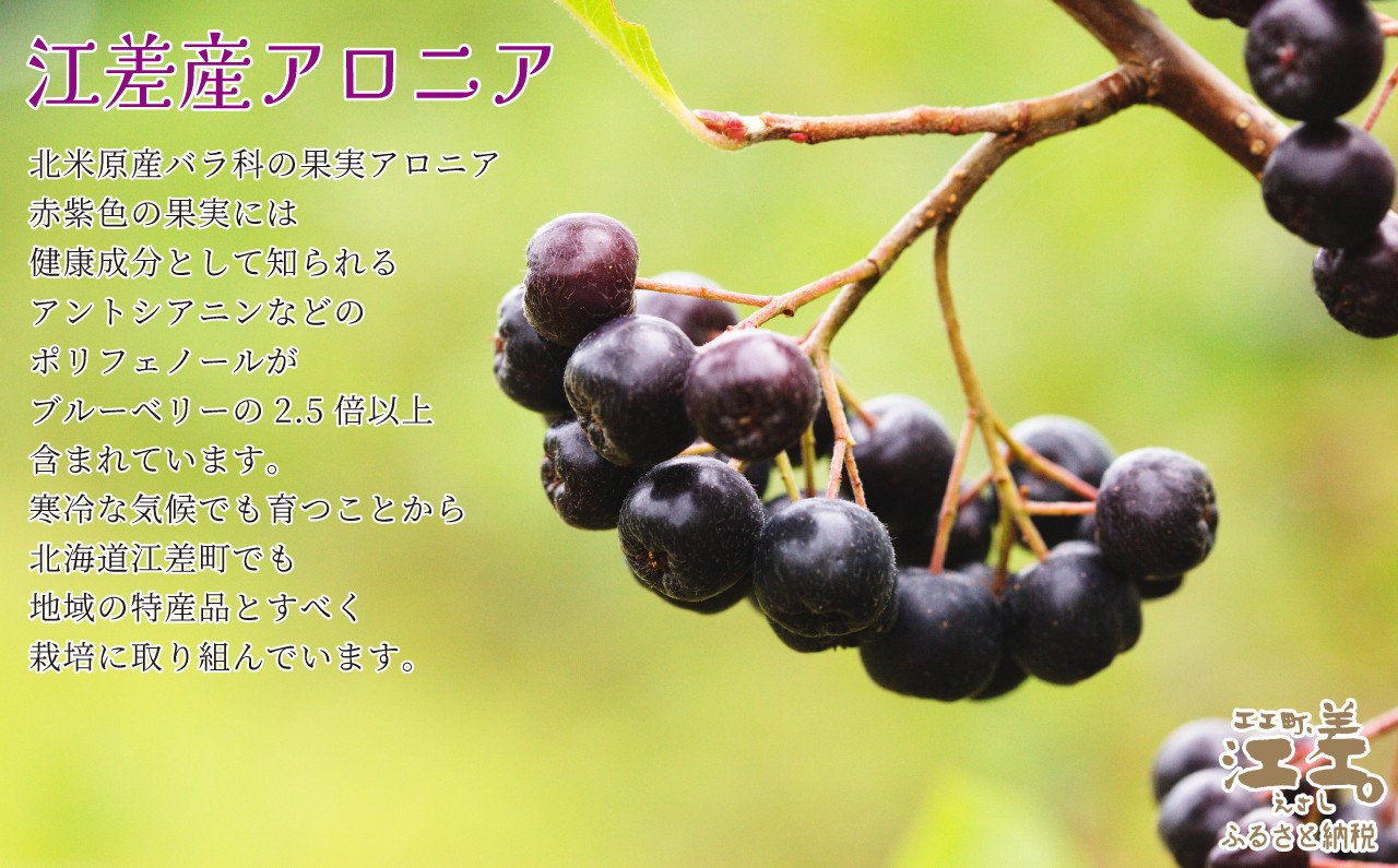 江差町内で栽培に取り組んでいる「アロニアベリー」をひと粒ひと粒手摘み。ごろっとした果実の食感が楽しめるプレザーブスタイルのジャムに加工しました。