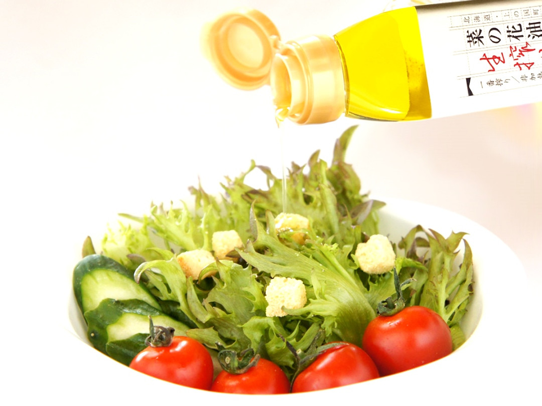 菜の花油は、国産種・キザキノナタネ(遺伝子組み換えではない)を無農薬で栽培。