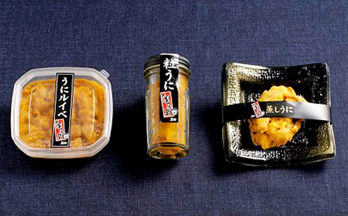 添加物を一切使わずに塩だけで一夜漬けにした「粒うに」、生うにに近い滑らかな舌触りの「うにルイベ」、うにの一粒一粒を感じられる甘みの強い「蒸しうに」。