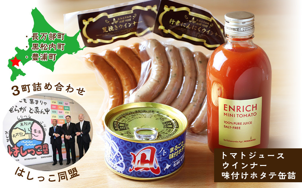 【はしっこ同盟(長万部・黒松内・豊浦)セット】トマトジュース・ウインナー・味付けホタテ缶詰 3町詰め合わせ