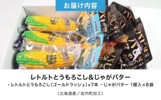 | 容量 | ・レトルトとうもろこし(ゴールドラッシュ)×7本 (北海道産/岩内町加工) ・じゃがバタ―1個入×8袋(北海道産/岩内町加工) |