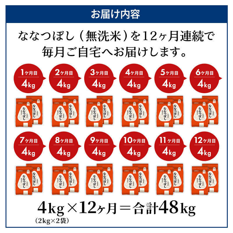 12ヵ月 定期便 (無洗米4kg)ホクレン喜ななつぼし(無洗米2kg×2袋) 北海道米 お米 白米 ごはん ご飯 ライス 和食 炭水化物 主食 おにぎり お弁当 ほど良い粘り 豊かな甘み つややか 特A [JA新おたる]