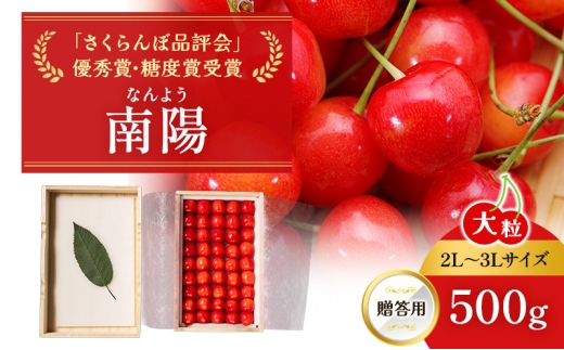 ※掲載画像に大事なご案内があります。ご了承の上お申込ください※ 【配送不可地域:沖縄県、離島】 北海道果樹協会の「さくらんぼ品評会」で、優秀賞・糖度賞を何度も受賞している、北海道仁木町の嶋田茂農園「匠」。 こだわりの栽培方法で大切に育てた大粒のさくらんぼ2L~3Lサイズ【南陽】を、贈答用の専用桐箱に入れてお届けします。 大粒なさくらんぼで、果肉は果汁たっぷりですが、濃厚な甘さではなくさっぱりとした甘さが特徴です。 ※画像はイメージです。 ※掲載画像に大事なご案内があります。必ずご覧いただきご了承の上お申込みをお願いいたします。 ※オンライン決済限定商品です。 ※収穫したてのものを順次発送致しますので、お届け日の指定は出来ません。 ※天候や収穫状況により、お届けや規格が変更になる場合がございます。 ※沖縄県、離島へのお届けはできません。 ※上記のエリアからの申し込みは返礼品の手配が出来ないため、「キャンセル」または「寄附のみ」とさせていただきます。予めご了承ください。 ※配送時の揺れや傾きにより若干の傷が生じる場合がございます。 ※出荷時期に、別途お届けについてのご案内メールを配信いたします。必ずご確認ください。 ※商品受取後すぐに商品の状態をご確認ください。 万が一開封した時点で傷みがあった場合は、お手数ではございますが、開封した時点の画像とお品物を保管の上、お問合せセンターまでご連絡ください。 ※お届けからお時間が過ぎてからの交換は致しかねます。 ※ご不在等により、商品を受け取れなかった場合の再出荷は致しかねます。 ※商品到着後、早めにお召し上がりください。 ※賞味期間:発送から3日程度 ※災害や天候の影響により収穫量が不足、または、品質を担保できない場合は、事前に連絡させていただきます。