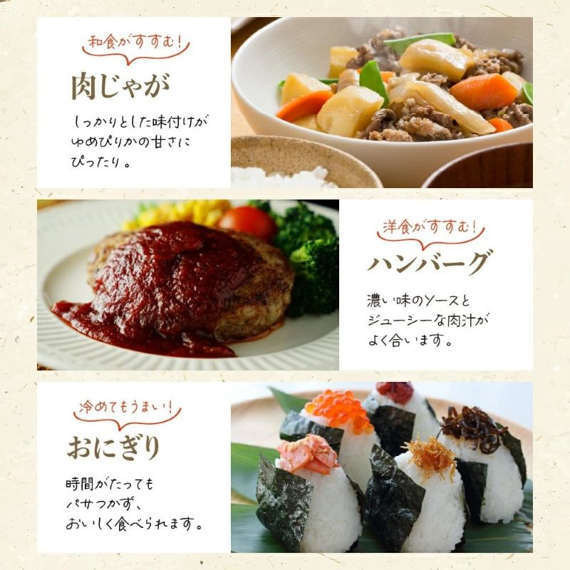 「ゆめぴりか」のおいしさのポイントは、味を左右するアミロースが低く、粘りがある(アミロースが低いほど粘りがある)こと。炊きあがりも、つややかです。北海道を代表するお米として是非ご賞味ください。