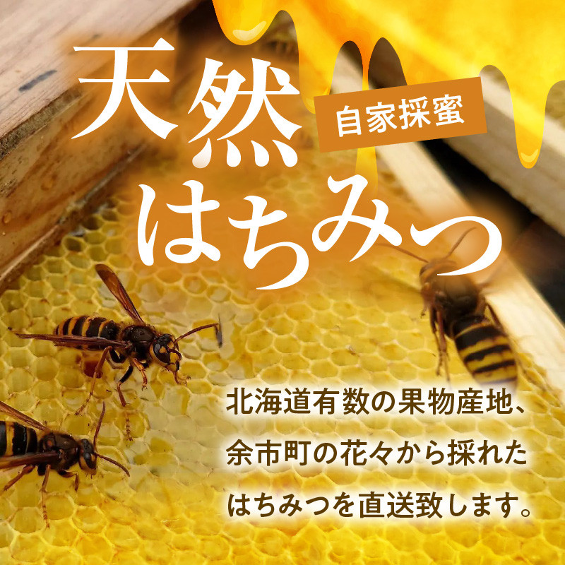北海道余市の果物の花が咲き誇る、5月からミツバチが集めた蜜で、濃厚な甘さと花の香りが広がる味わいになりました。