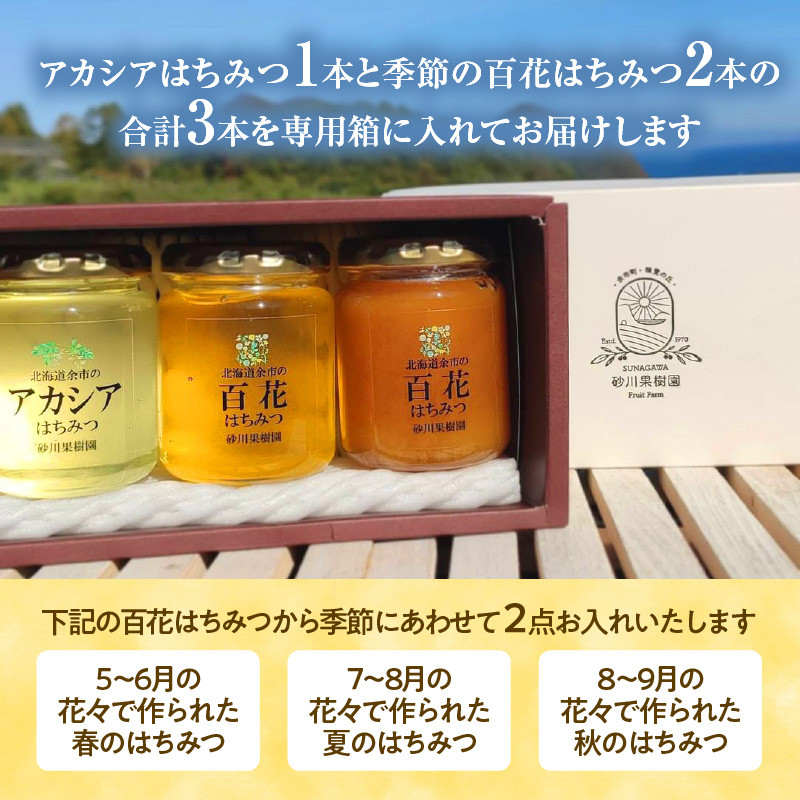 余市の砂川果樹園が贈る 季節の生はちみつセット(百花・アカシア) 3本セット