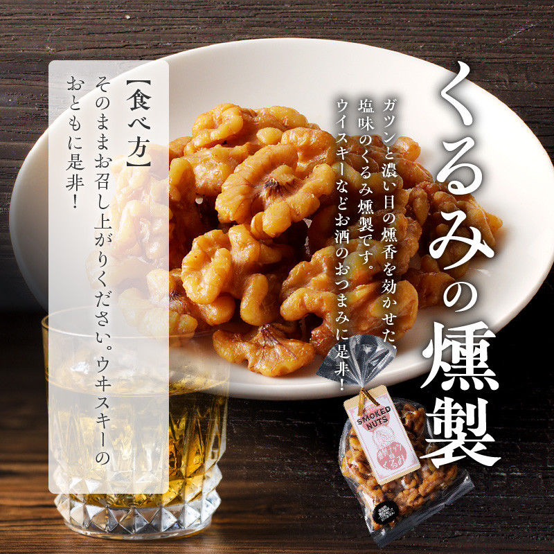 ガツンと濃い目の燻香を効かせた、塩味のくるみ燻製です。ウイスキーなどお酒のおつまみに是非!